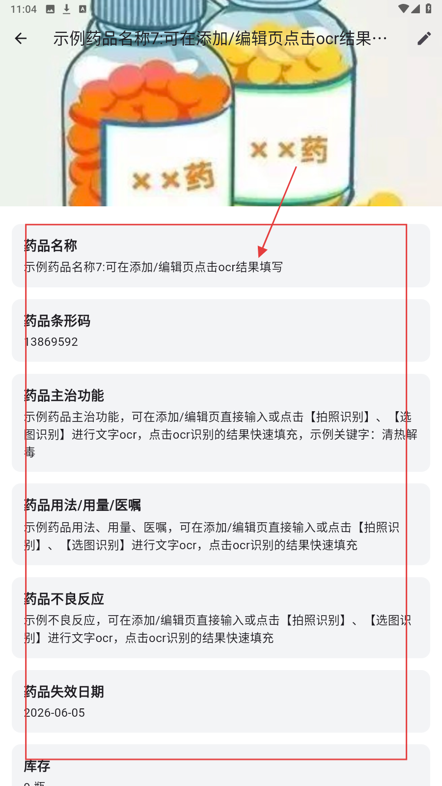 4、点药品条目,进入详情页,查名称、条码、功能等信息,可编辑更新药品数据。