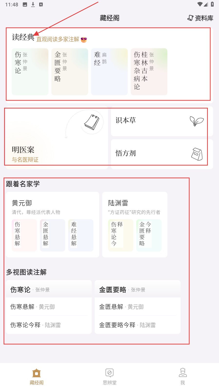 1、进入【藏经阁】页面,选【读经典】里的中医典籍,开启学习之旅。