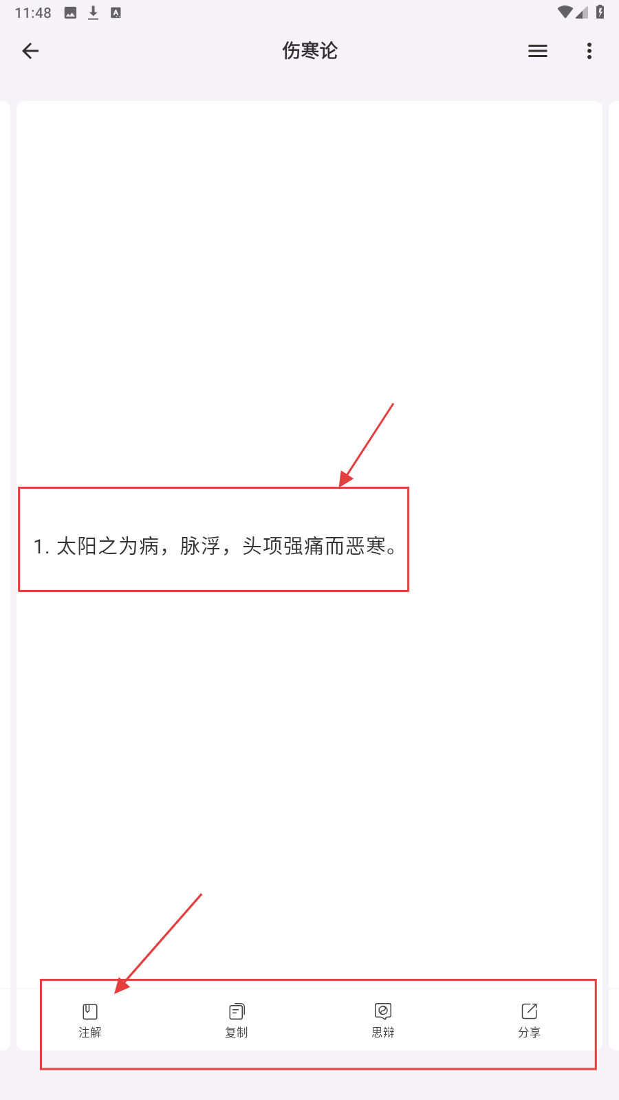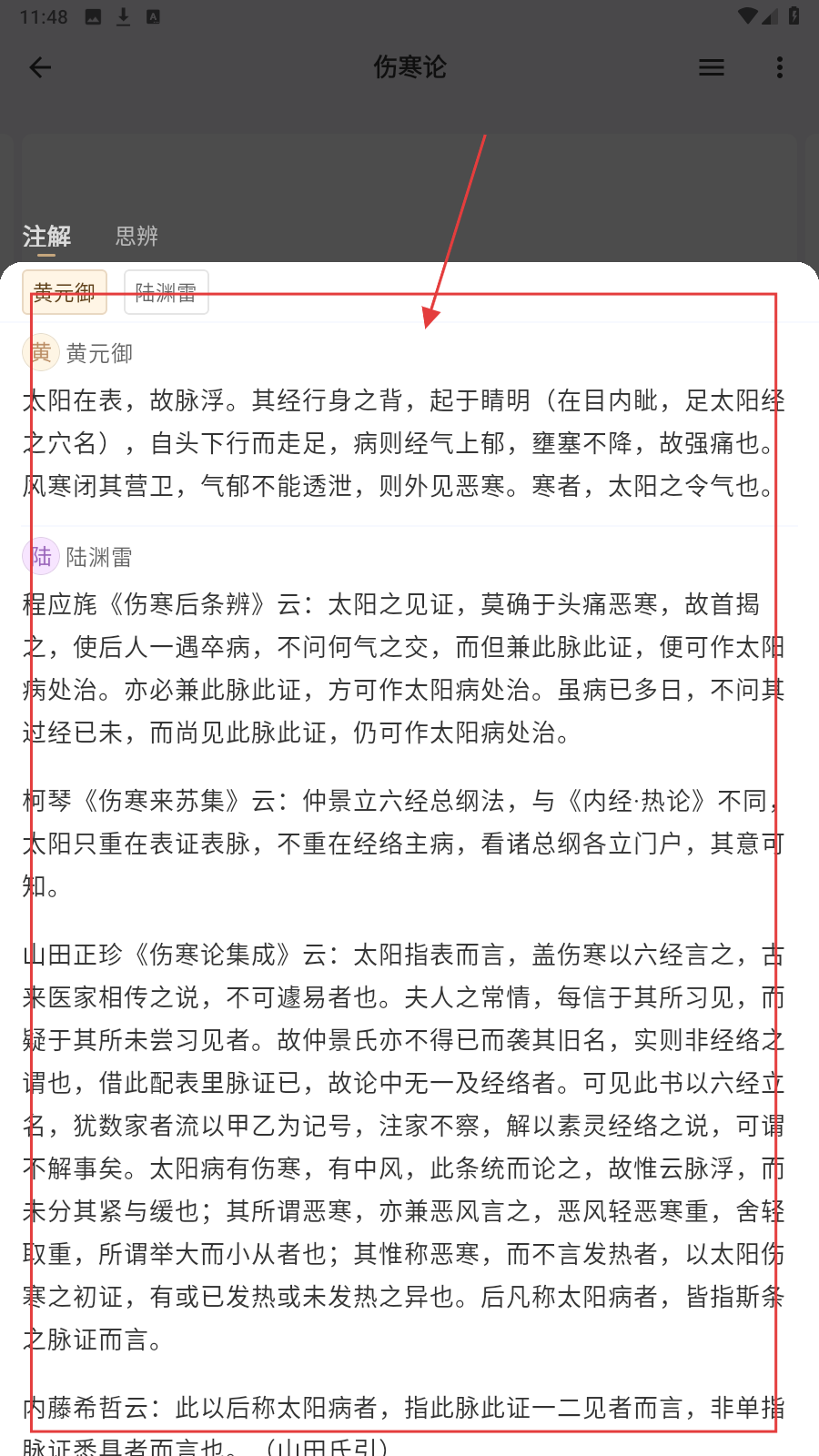 2、打开【伤寒论】条文,点【注解】,看名家对条文的解读内容。