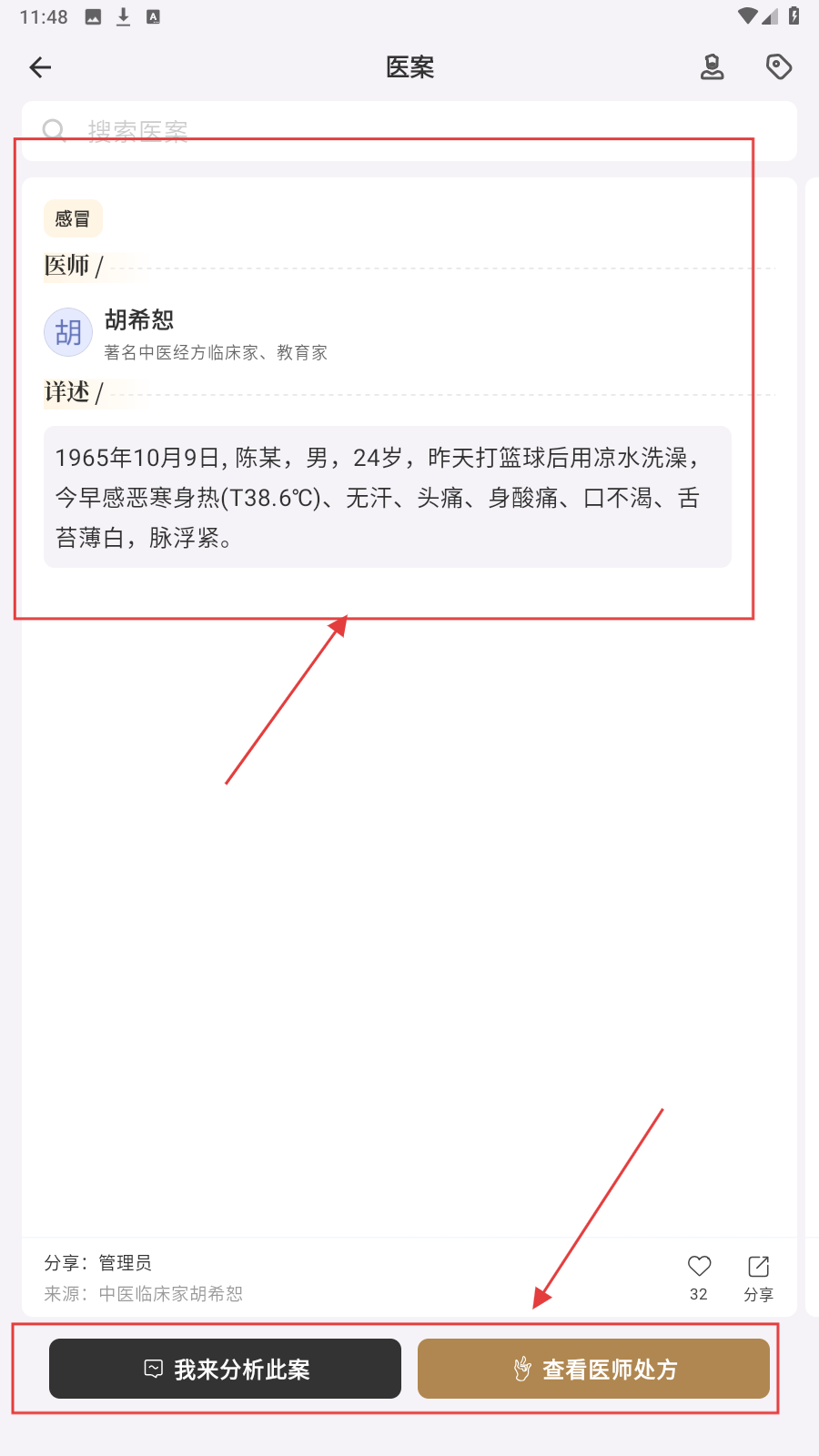 4、进入【医案】,看胡希恕的感冒案例,点按钮参与分析或看处方。