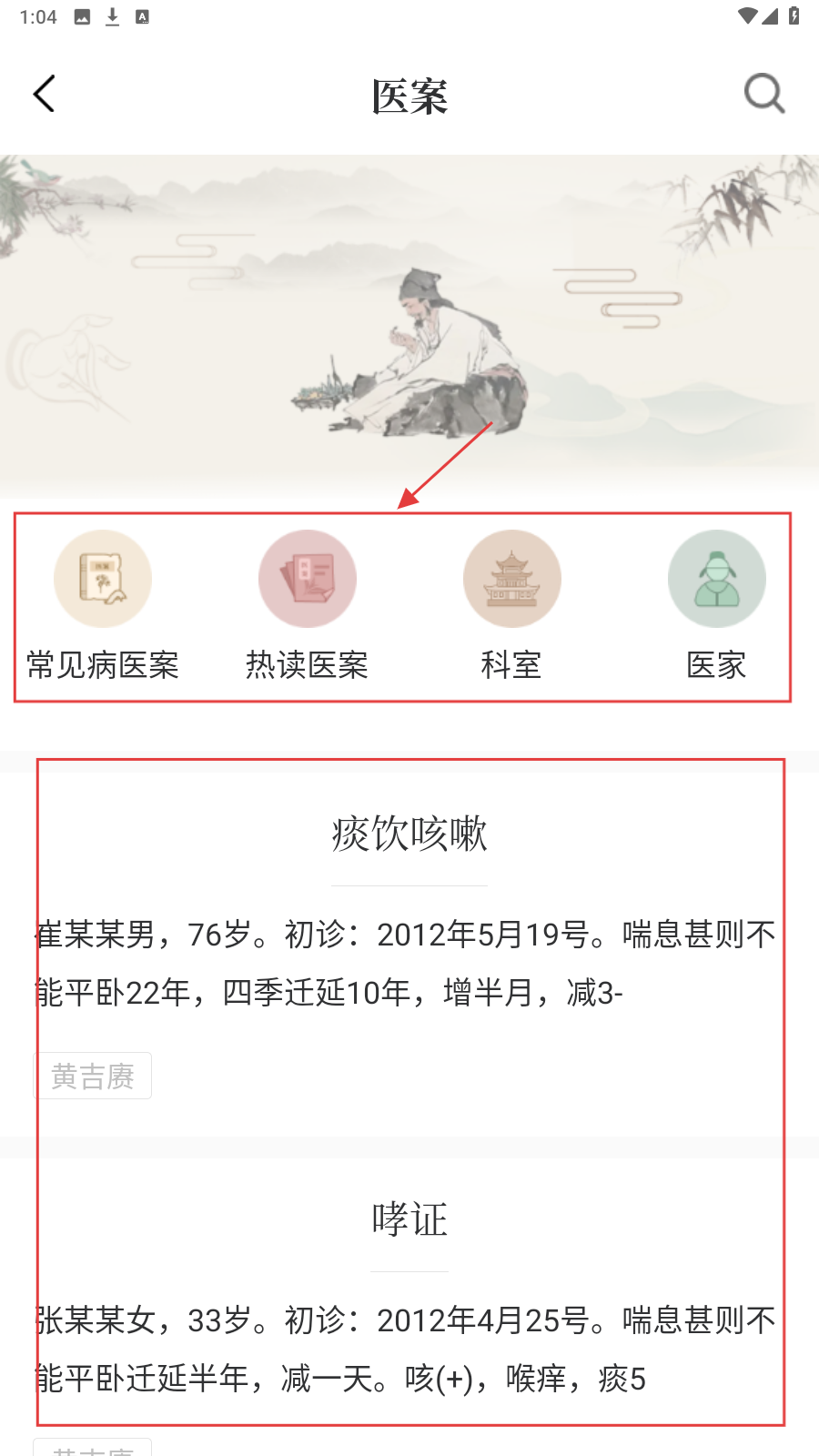 4、切换到【医案】页,按分类(常见病/热读等),研读医案提升经验。
