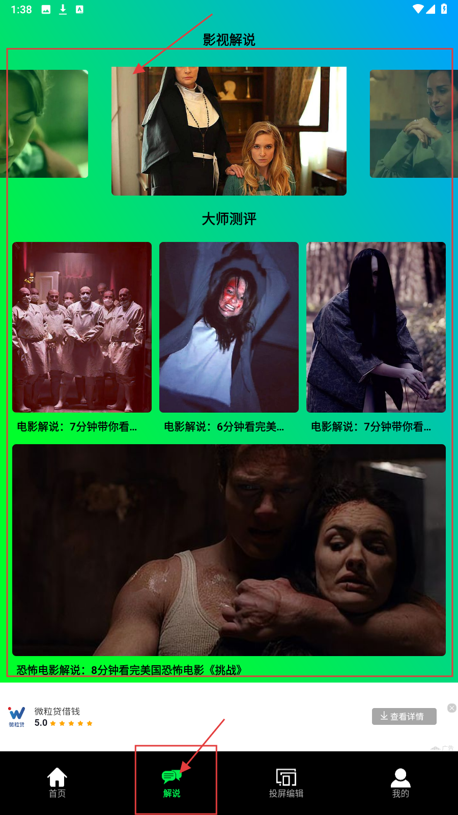 1、进入【解说】页,浏览【影视解说】【大师测评】板块,选感兴趣内容。