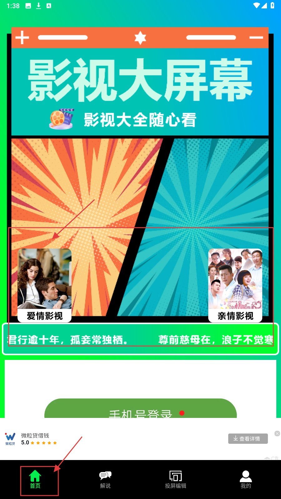 3、返回【首页】,选【爱情影视】等分类,探索对应影视资源。