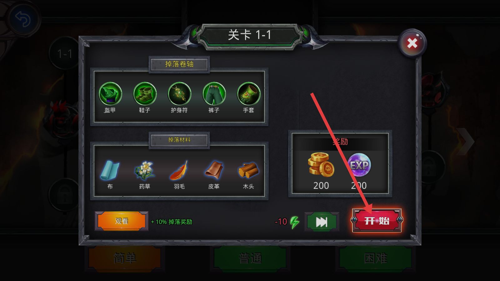 1、关卡【1-1】界面查看【盔甲-鞋子-护身符】等掉落,确认奖励后点击【开始】,开启战斗。