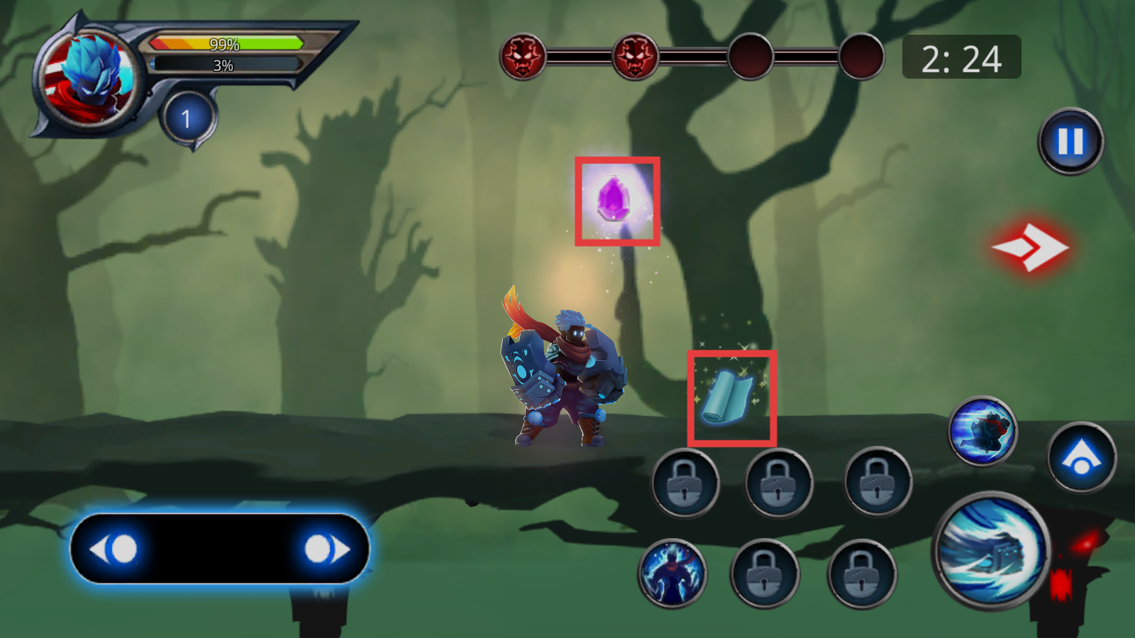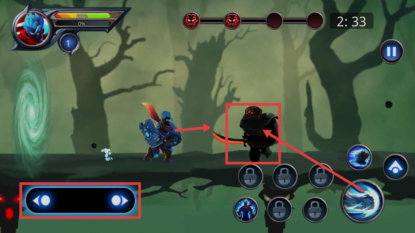 2、战斗时通过左侧摇杆操控移动,对准黑衣敌人,点击右侧技能按钮发起攻击,高效输出。