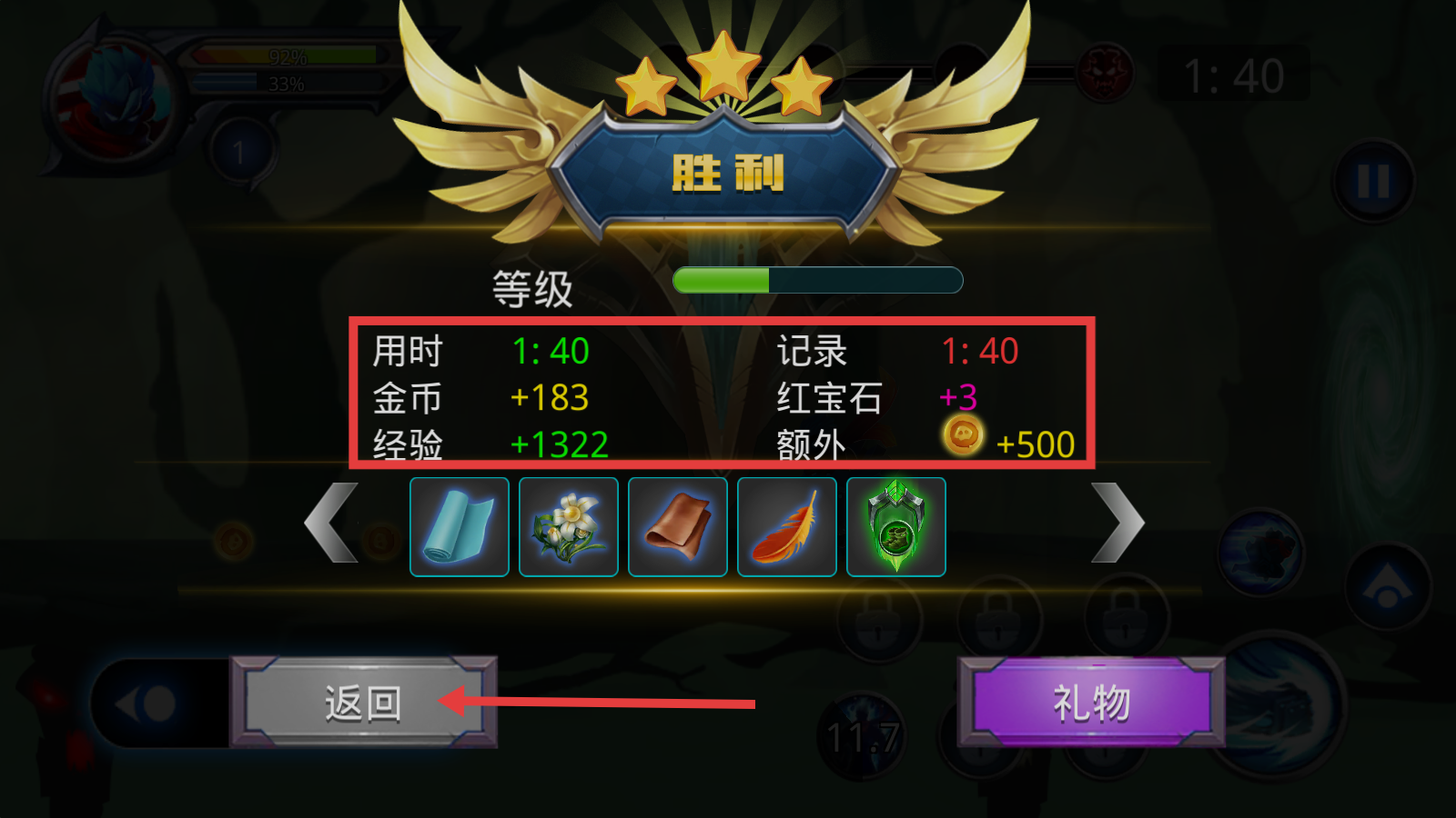 4、胜利后查看【金币+183-经验+1322】等奖励,点击【返回】,筹备后续关卡挑战。