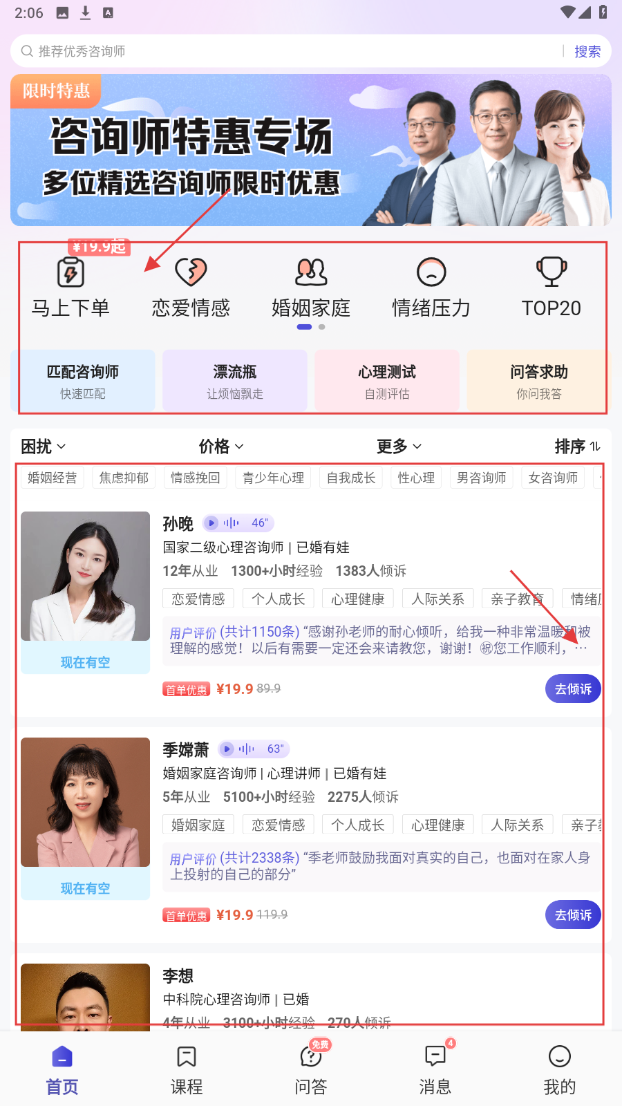 1、进入首页,按需选【恋爱情感】等分类,浏览咨询师列表挑合适的。
