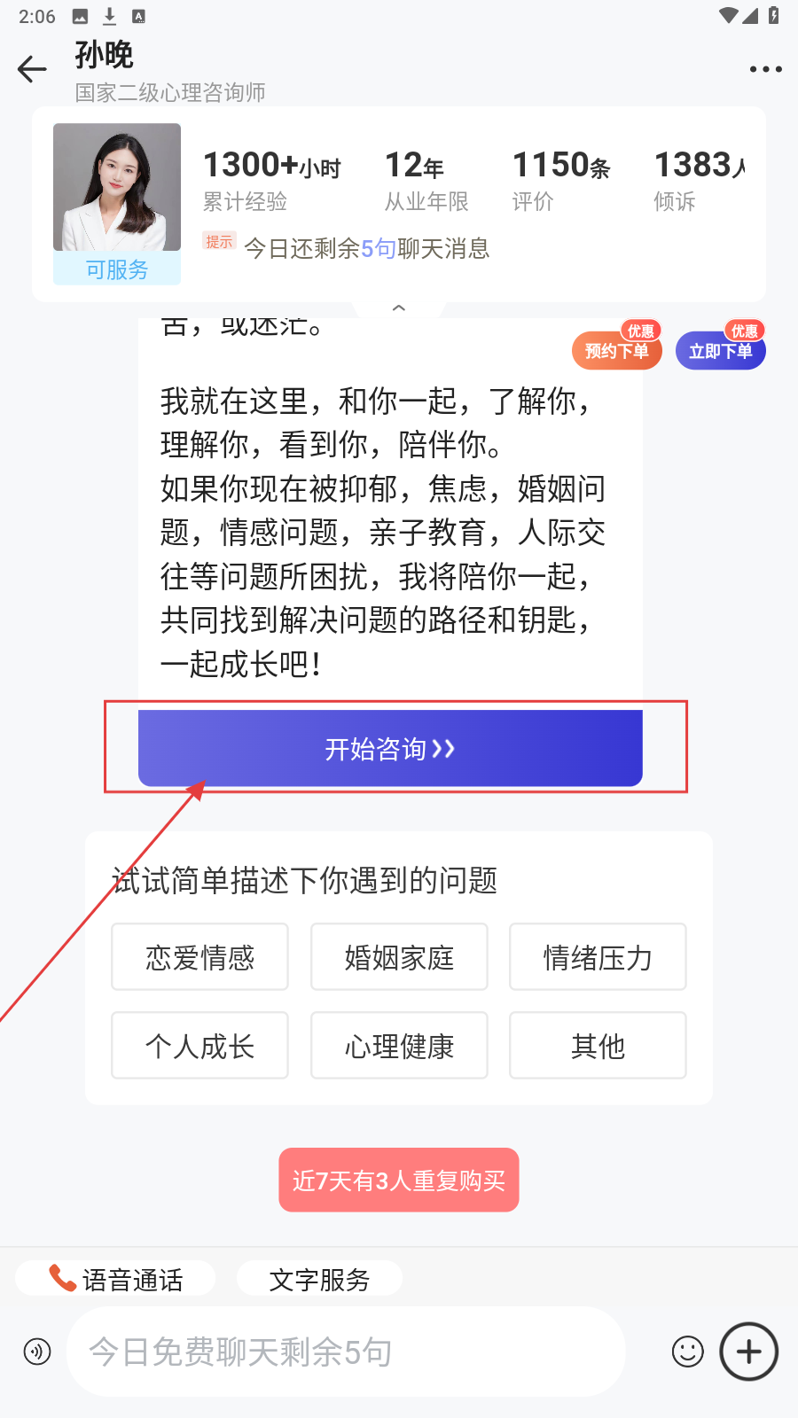 2、点选咨询师,如【孙晚】,进入主页看简介后点【开始咨询】。