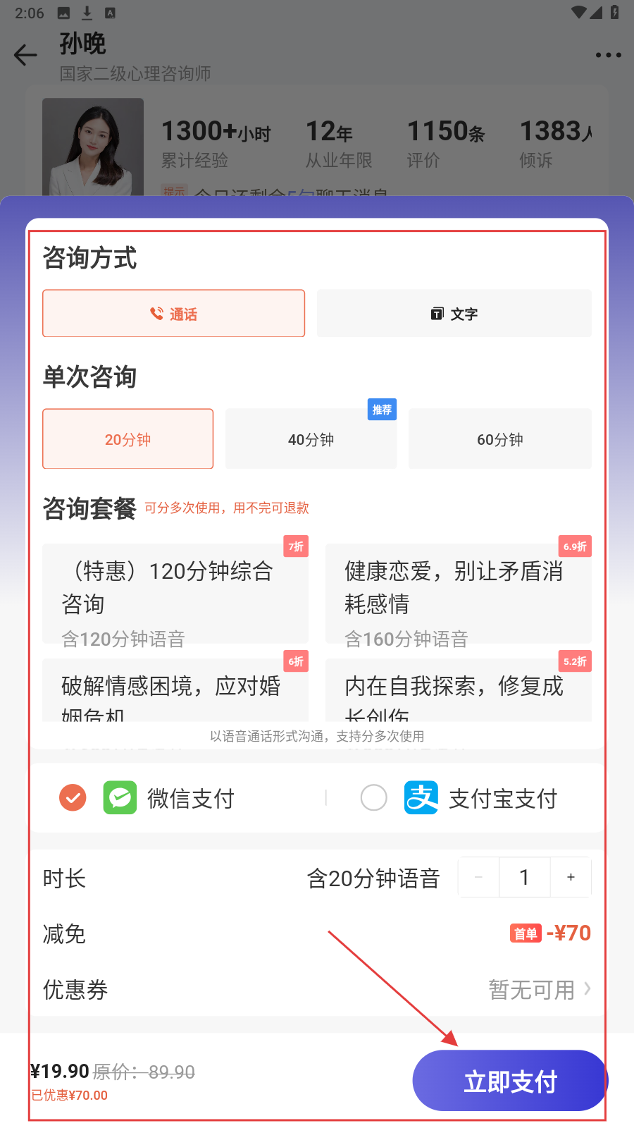 3、选咨询方式、时长等,确认后点【立即支付】完成下单。