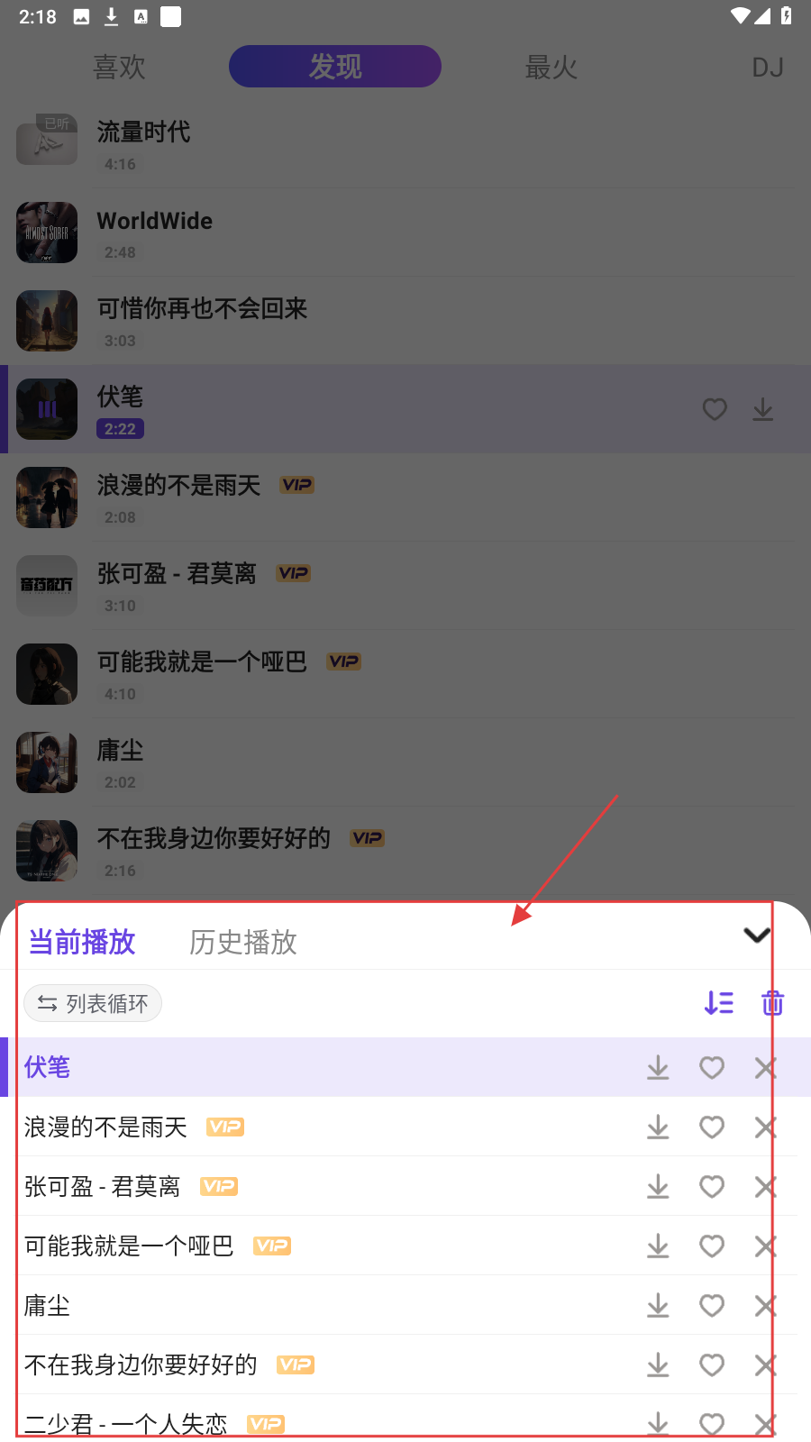 1、在【发现】页选喜欢的歌,点播放栏侧按钮管理播放列表。
