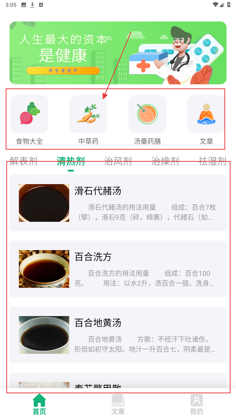 1、首页点击【中草药】,查看清热剂下如滑石代赭汤等中药方剂。