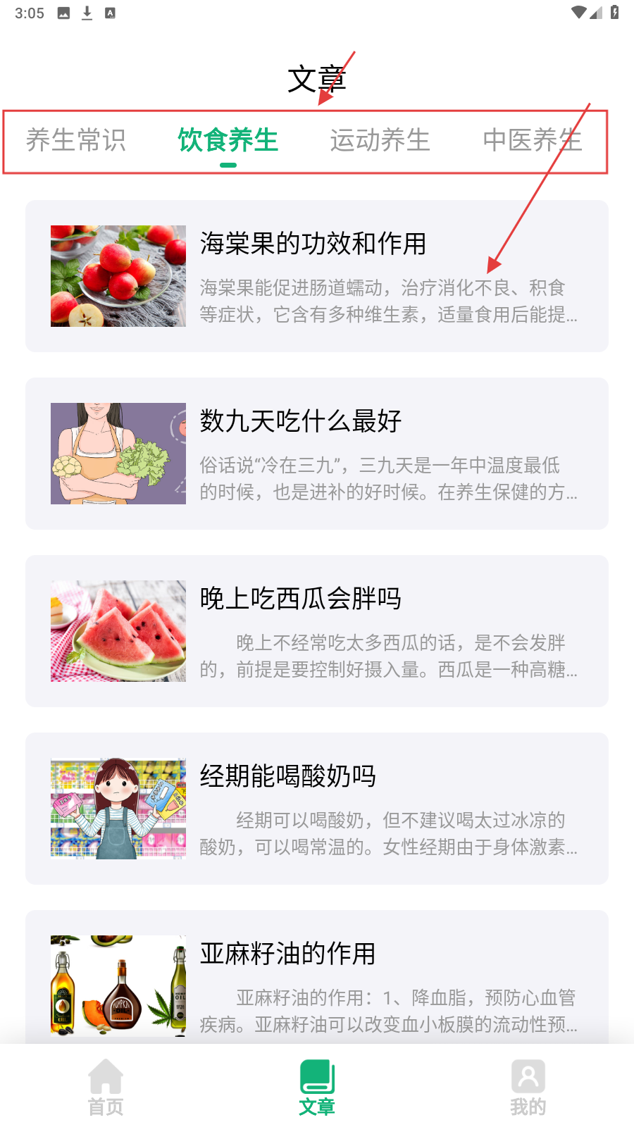 3、切换至文章页【饮食养生】,点击海棠果功效文章进行阅读。