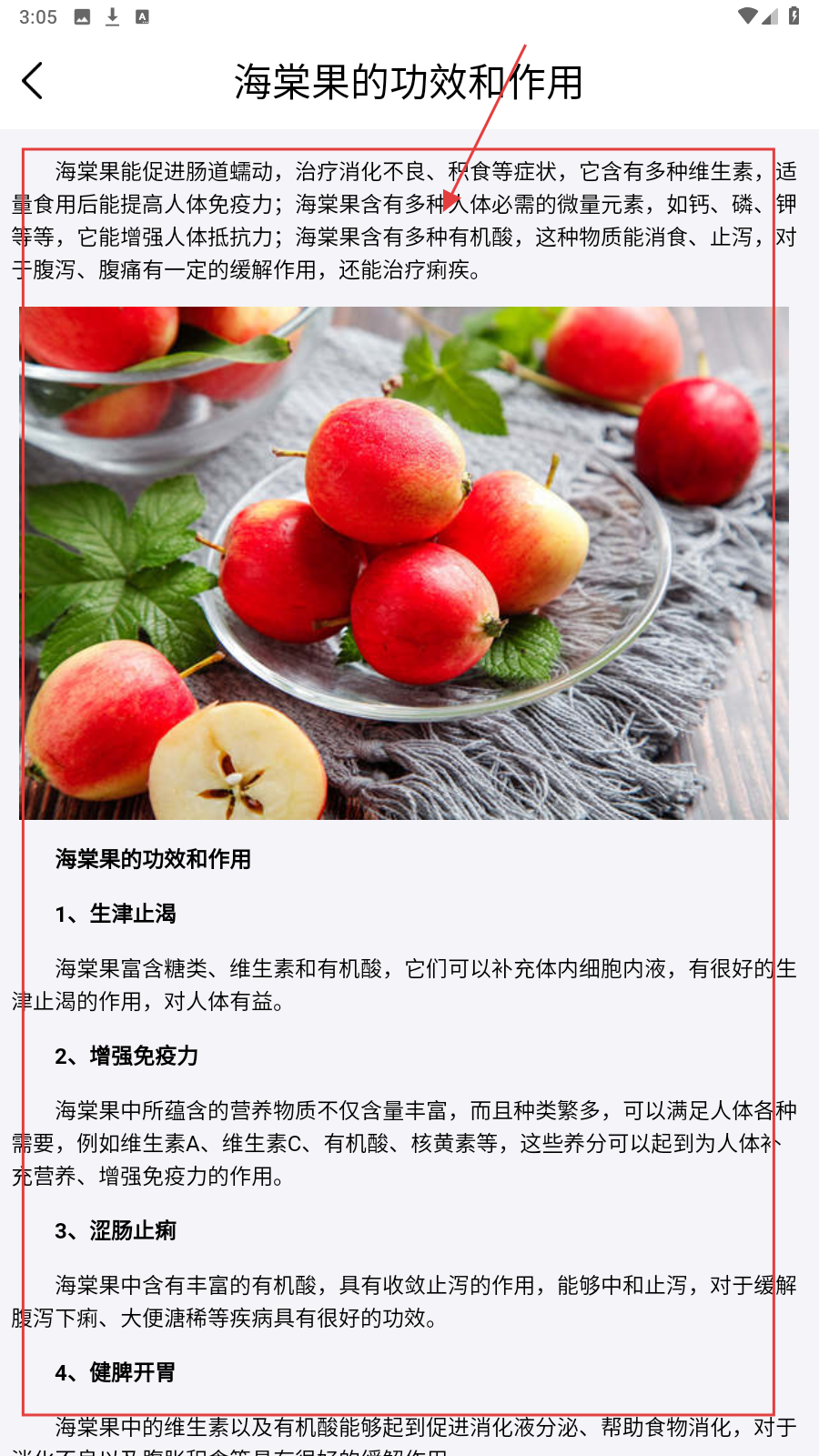 4、在海棠果详情页,学习其促肠道蠕动等功效及养生知识。