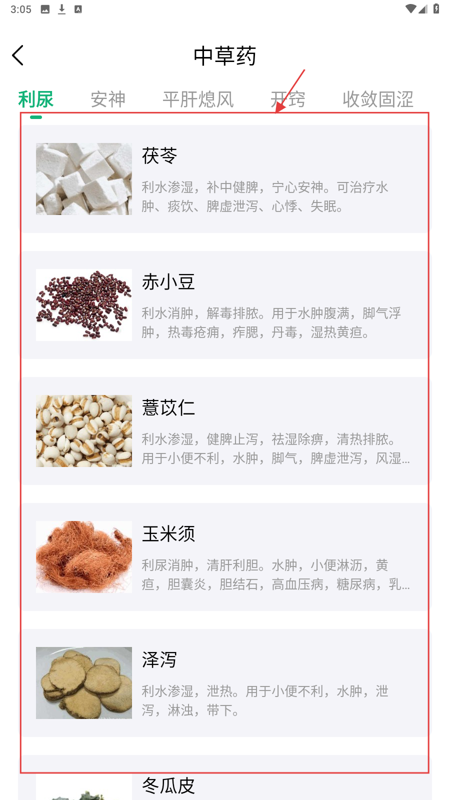 2、进入中草药页,选【利尿】分类,了解茯苓等药材功效作用。