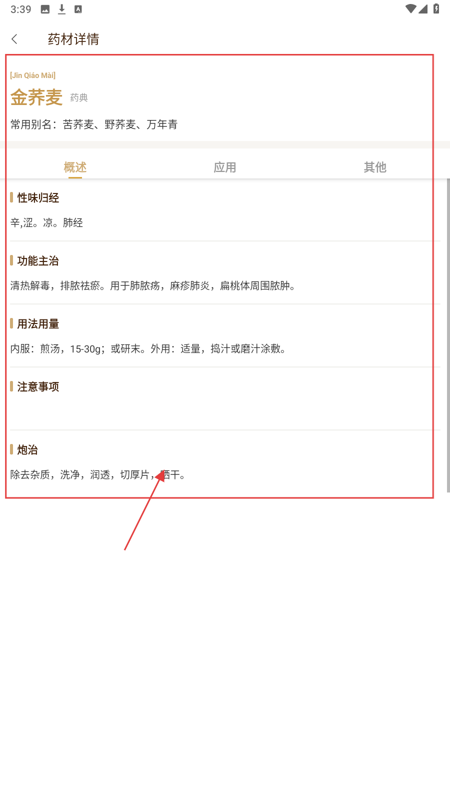 3、点击【金荞麦】,查看其性味归经、功能主治等详细药材信息。
