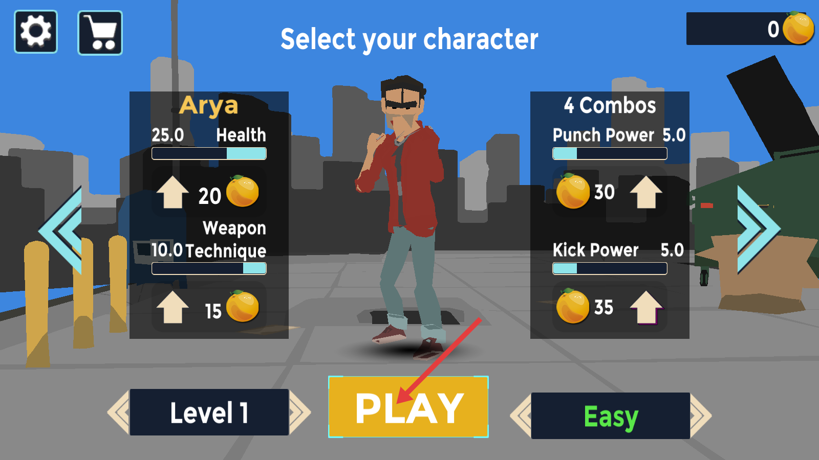 1、在角色选择页,选定【Arya】,点击中间【PLAY】,进入【Level1(Easy难度)】。