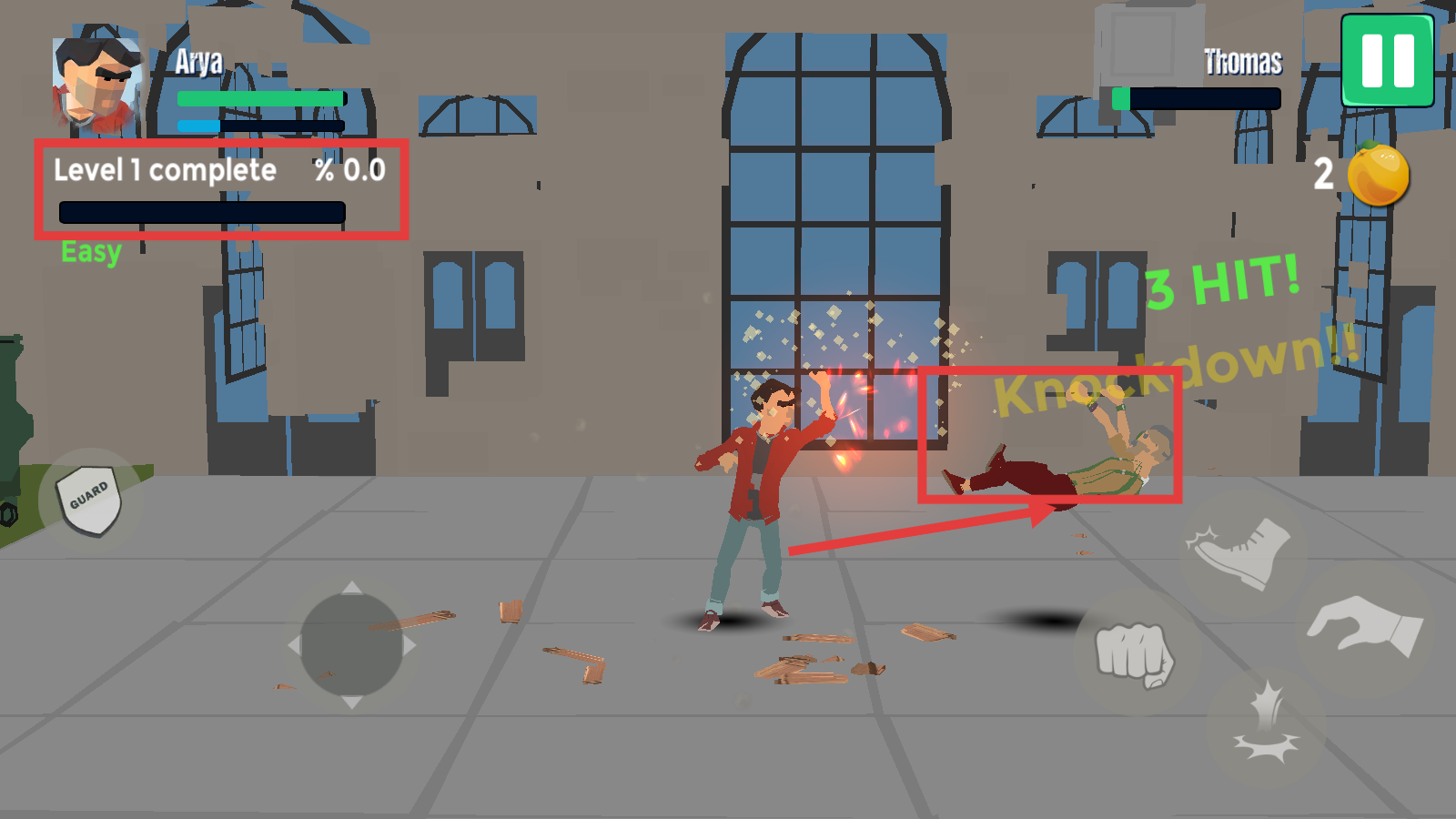 3、遭遇敌人【Thomas】,通过连击(如“3HIT”)将其击倒,推进左上角【Level1complete】进度。