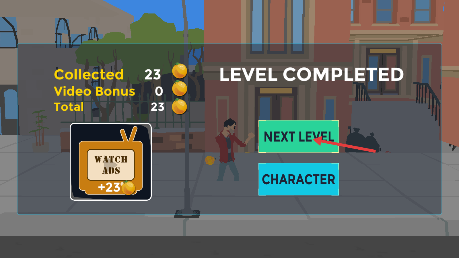 4、通关后领取【23个橘子】,点击【NEXTLEVEL】,进入下一关卡。