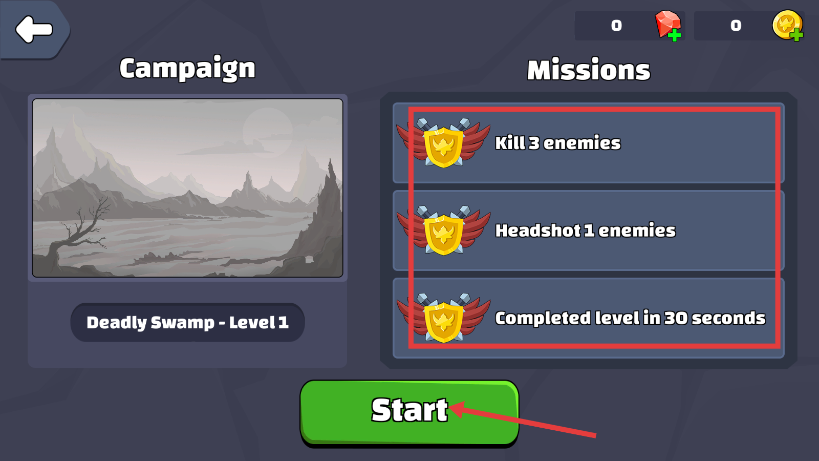 1、在关卡界面,确认右侧【Kill3enemies】【Headshot1enemies】【30秒内通关】任务,点击【Start】,进入【DeadlySwamp-Level1】。