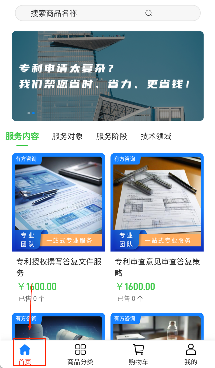 1、打开应用后可在首页浏览各类专利服务项目,通过技术领域、服务阶段等分类筛选快速定位目标服务,服务详情页展示完整内容与成功案例。