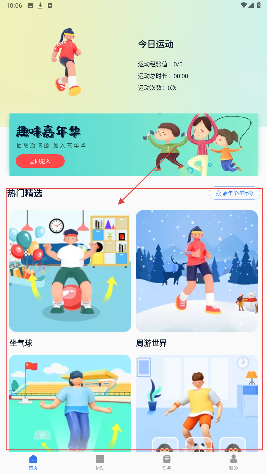 1、打开应用,在【首页】热门精选栏目下有坐气球、周游世界等运动项目,按需选择,如点击【坐气球】。