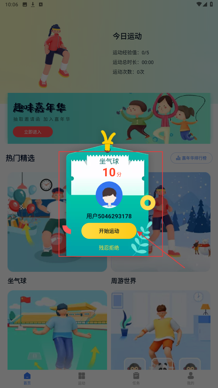2、点击后弹出【坐气球-10分】弹窗,点【开始运动】,就能进行该项目。