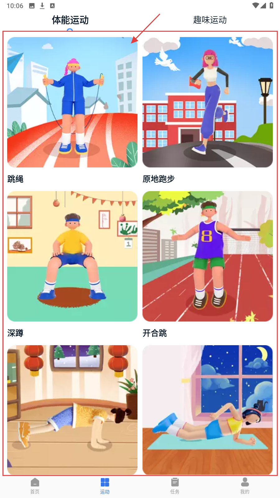 3、切换到【运动】页面,可以选择体能运动或趣味运动,如点击【跳绳】。