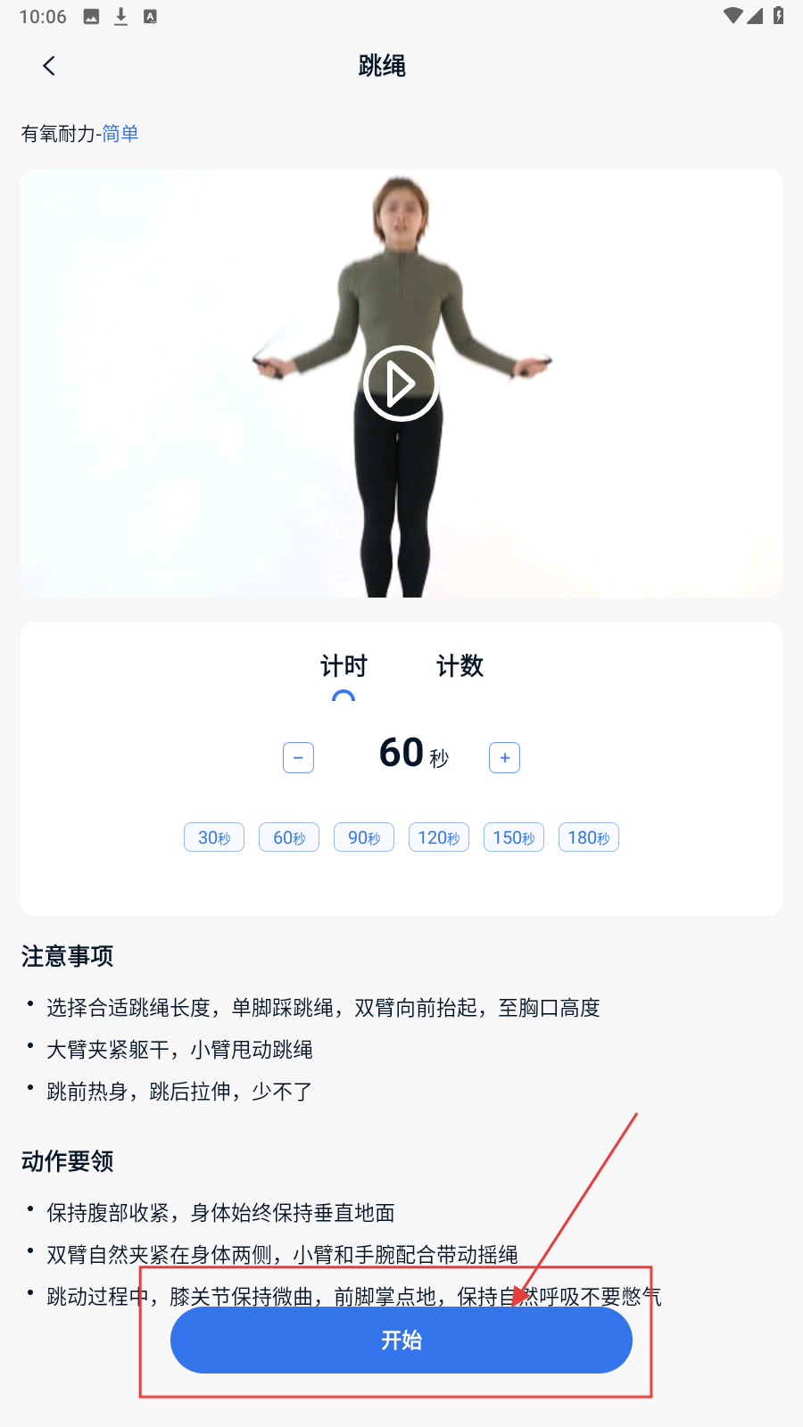 4、进入【跳绳】界面,自定义设置时间等,设置完成点击【开始】进行运动即可。