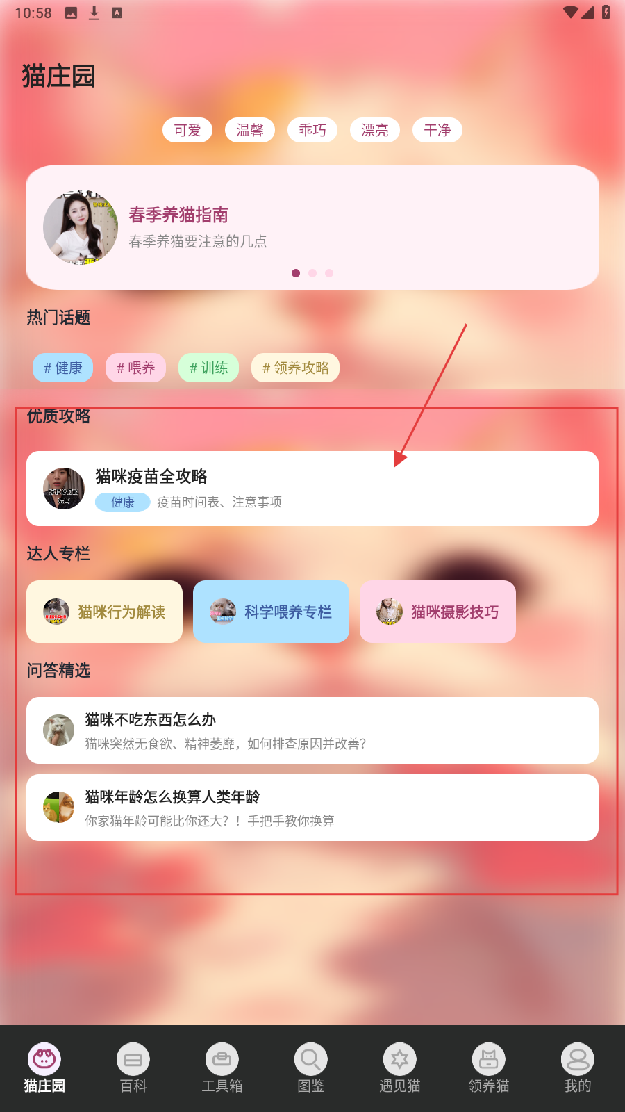 1、打开应用,在【猫庄园】页面优质攻略栏目下,点击【猫咪疫苗全攻略】了解疫苗知识。