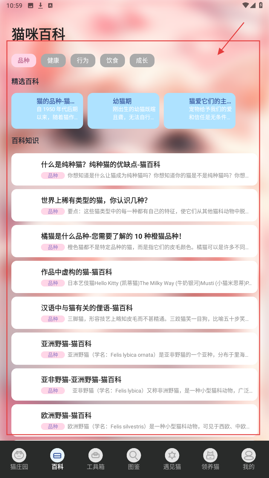 4、还可以切换至【百科】页面,查看猫咪百科,了解猫咪常识。