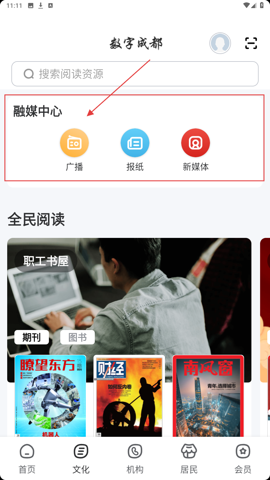 1、进入【数字成都】,找【融媒中心】,点【广播】【报纸】【新媒体】可浏览对应内容。