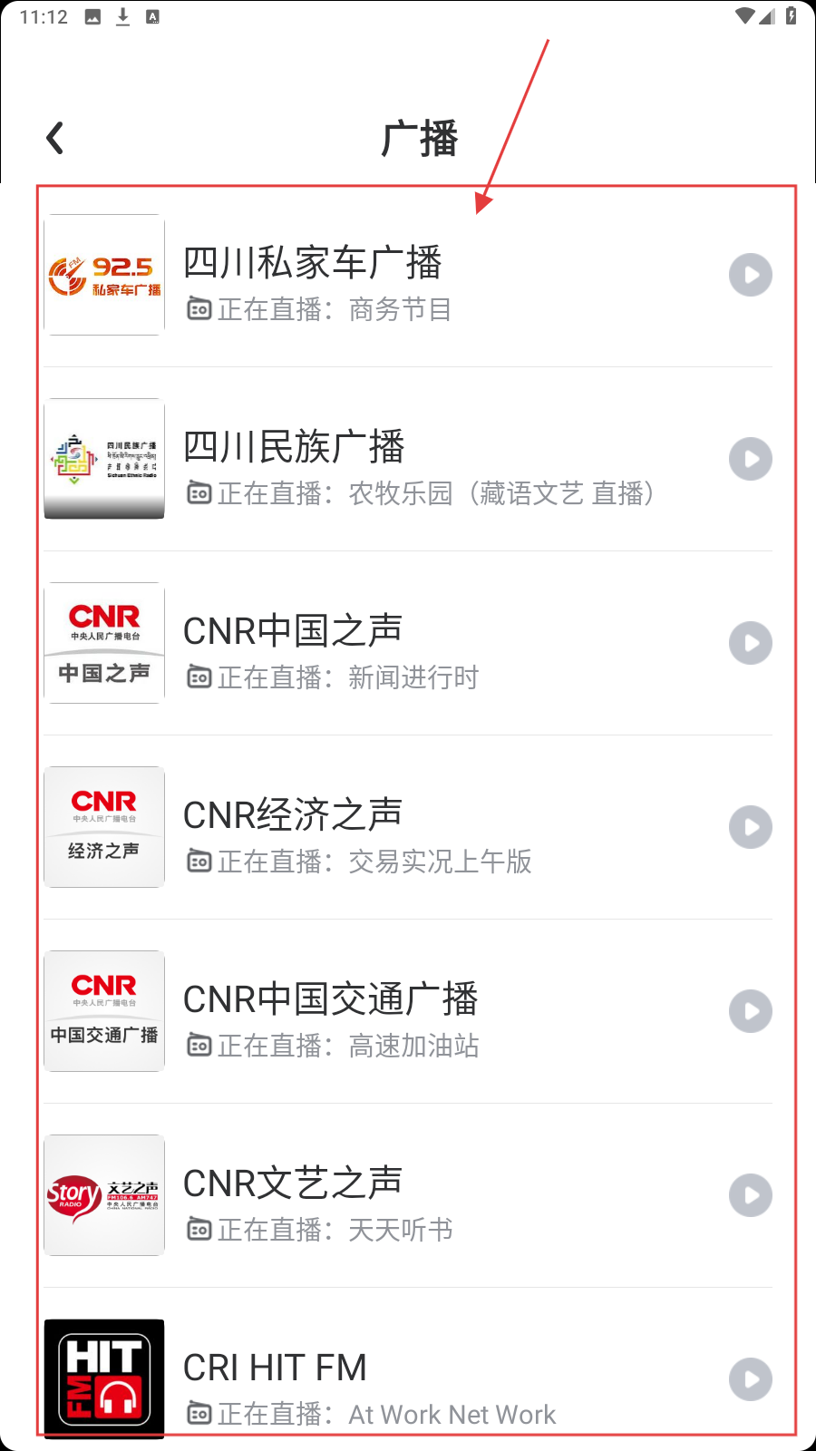 2、在【广播】页面,选想听的频道,如【四川私家车广播】等,点播放键即可收听。