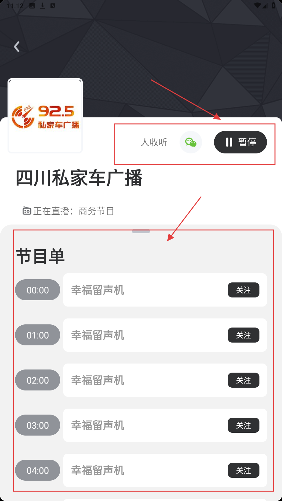 3、播放广播后,可点【暂停】控制播放,下滑看【节目单】,按需关注节目。