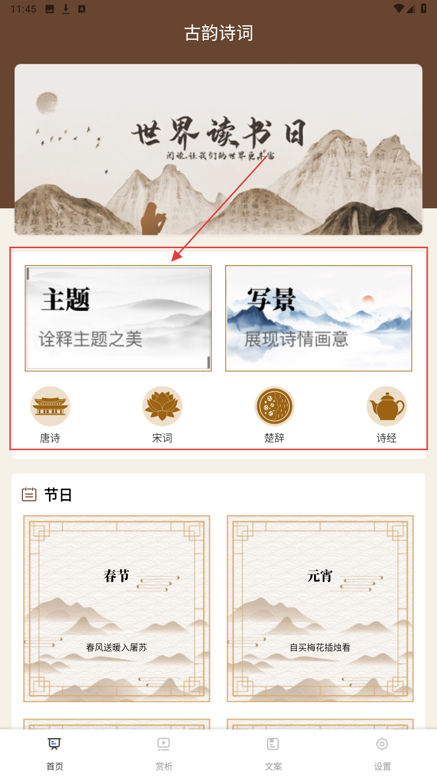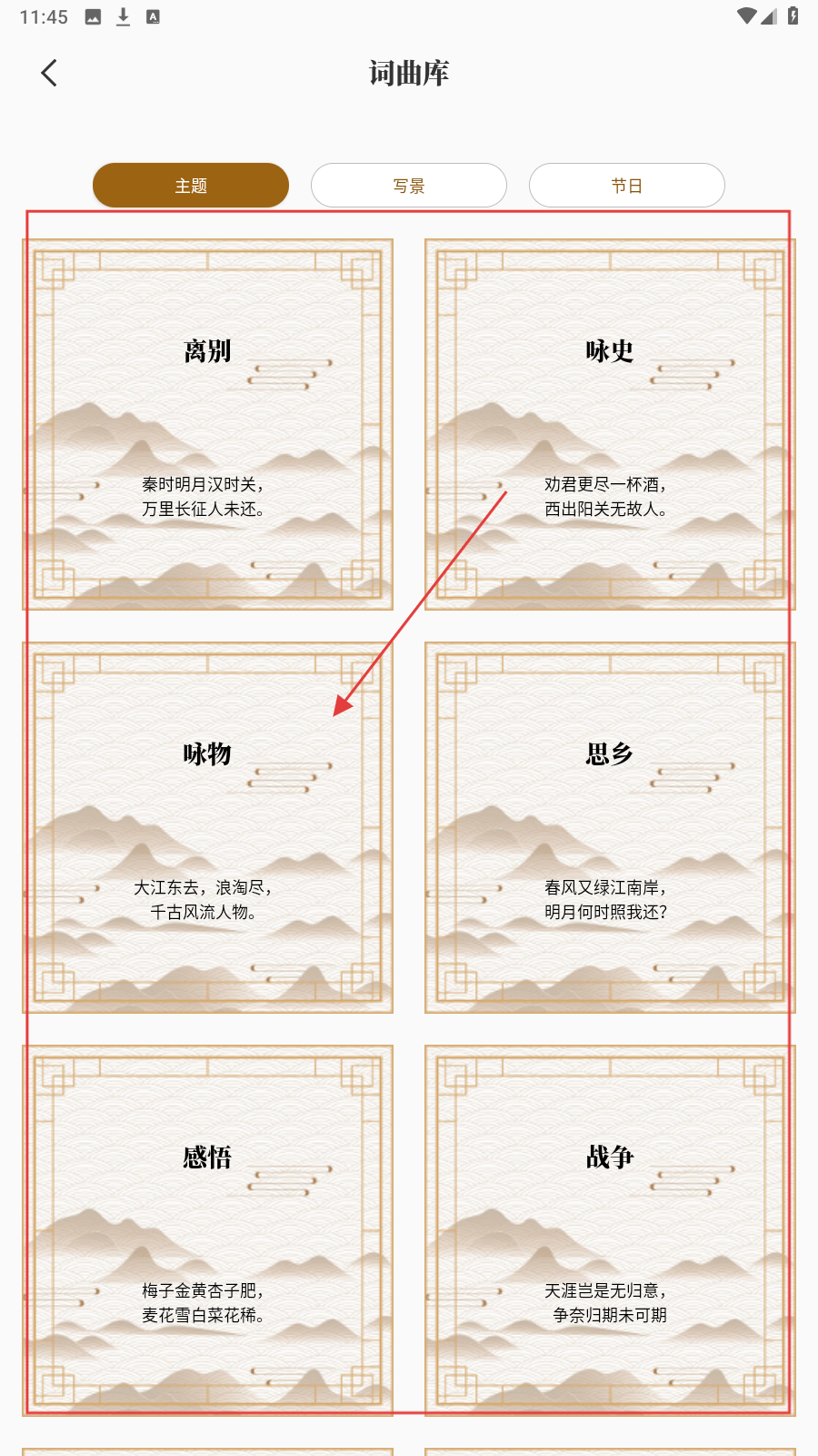 1、进入应用,选【主题】或【写景】板块,点【唐诗】【宋词】等类别探索诗词。