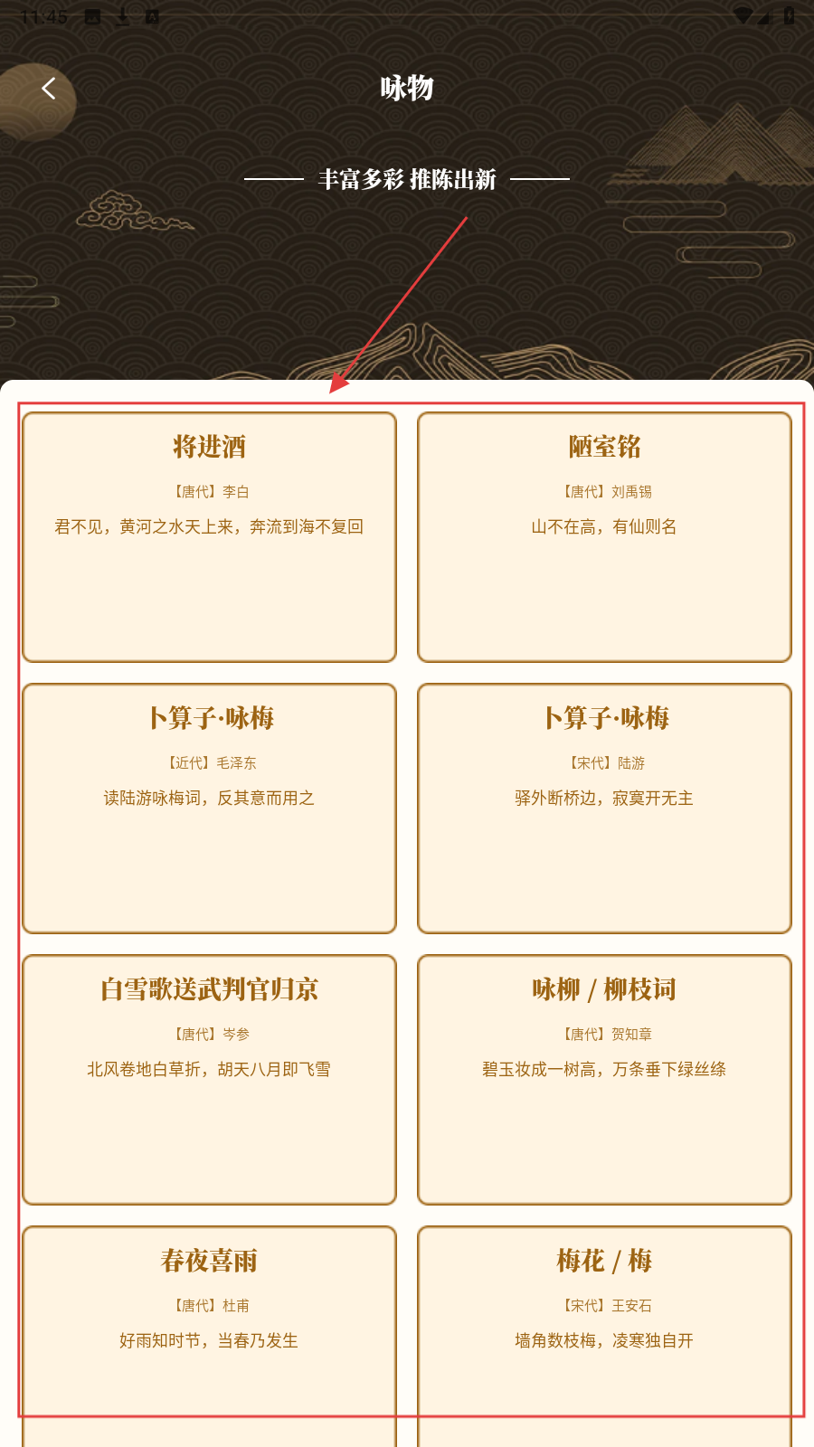 3、进入【咏物】主题,点选具体诗词卡片,如【将进酒】,查看诗词基本信息。