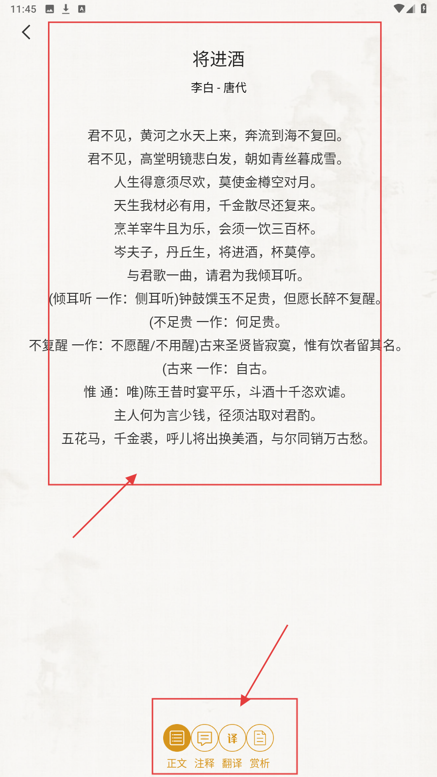 4、打开诗词详情,可切换【注释】【翻译】【赏析】,辅助深入理解【将进酒】内容。