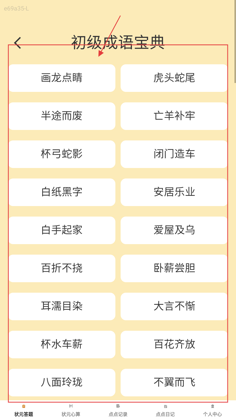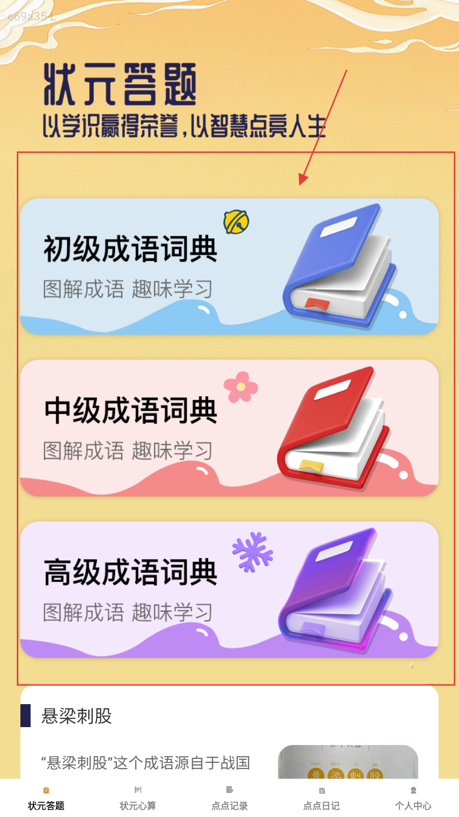 1、进入【状元答题】页面,可从【初级成语词典】开始,图解学习成语,积累基础学识。
