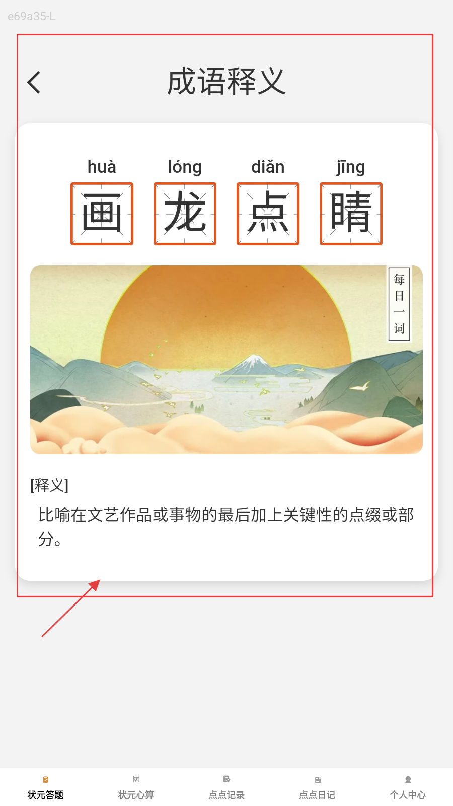 3、点开成语如【画龙点睛】,研读其释义,借助插画辅助,掌握成语用法。