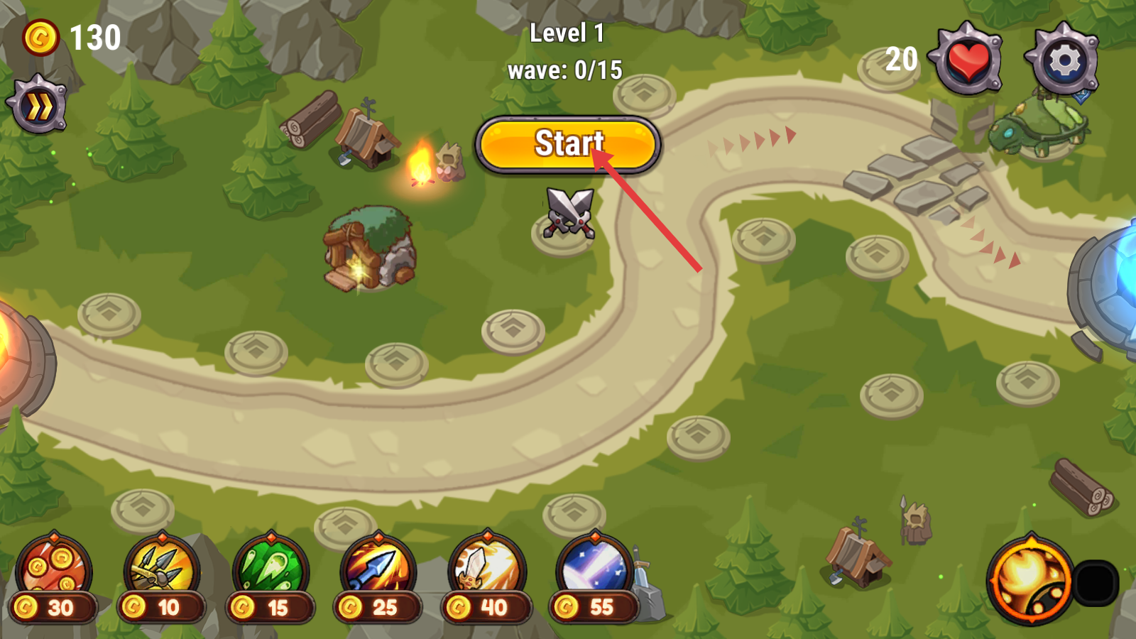 1、开局查看【Level-1】【wave-0/15】与金币,点击【Start】启动战斗,规划防御塔落点。