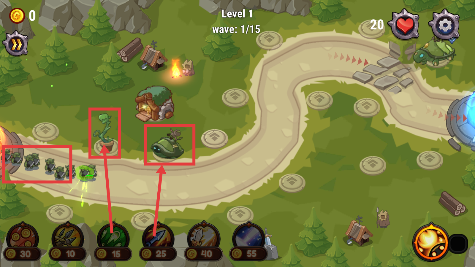 2、波数【1/15】开启后,用初始金币在关键位部署【植物】【机甲】类防御塔拦截敌人。