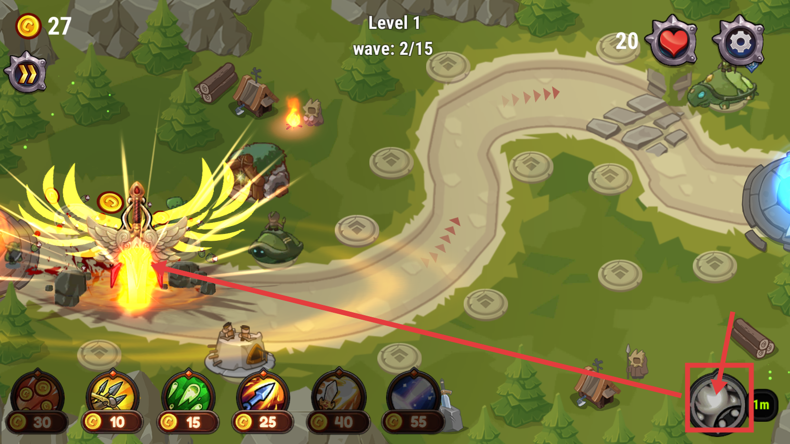 3、战斗至【wave-2/15】时,留意右下角技能,敌人密集时释放,配合塔防高效清怪。