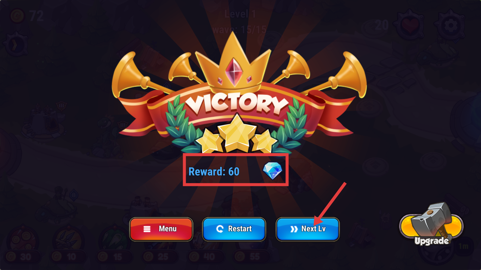 4、通关后领取【Reward-60】钻石,点击【Next-Lv】进入下一关,积累资源强化战力。