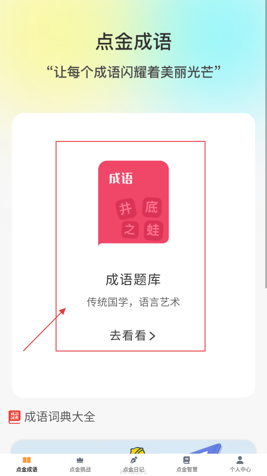 1、进入【点金成语】,先点【成语题库】,了解传统国学成语,为答题做准备。
