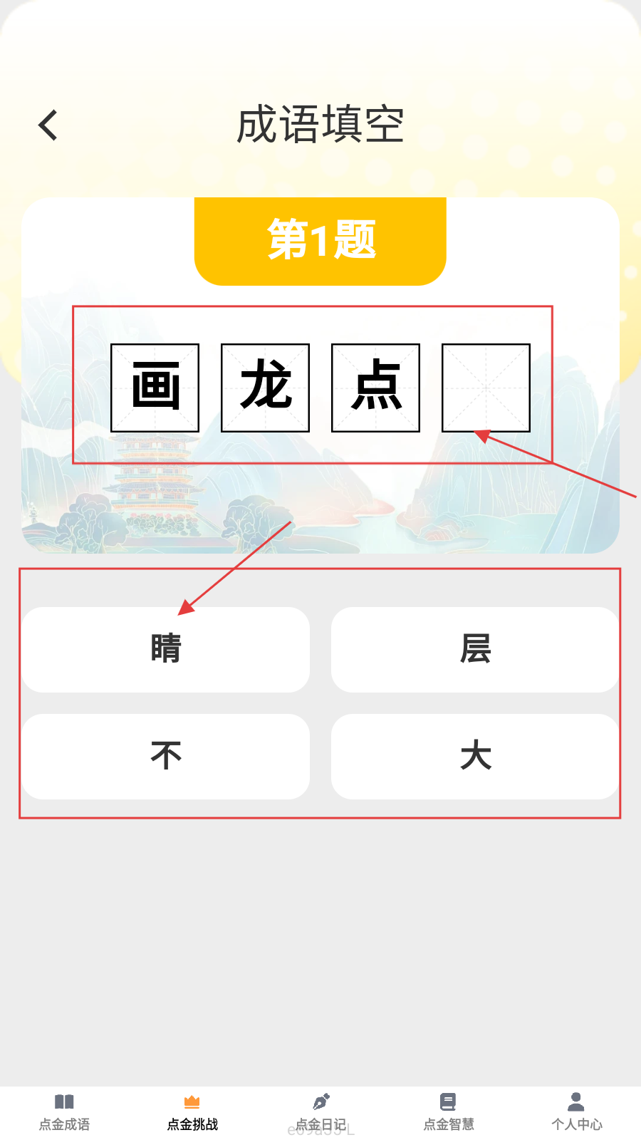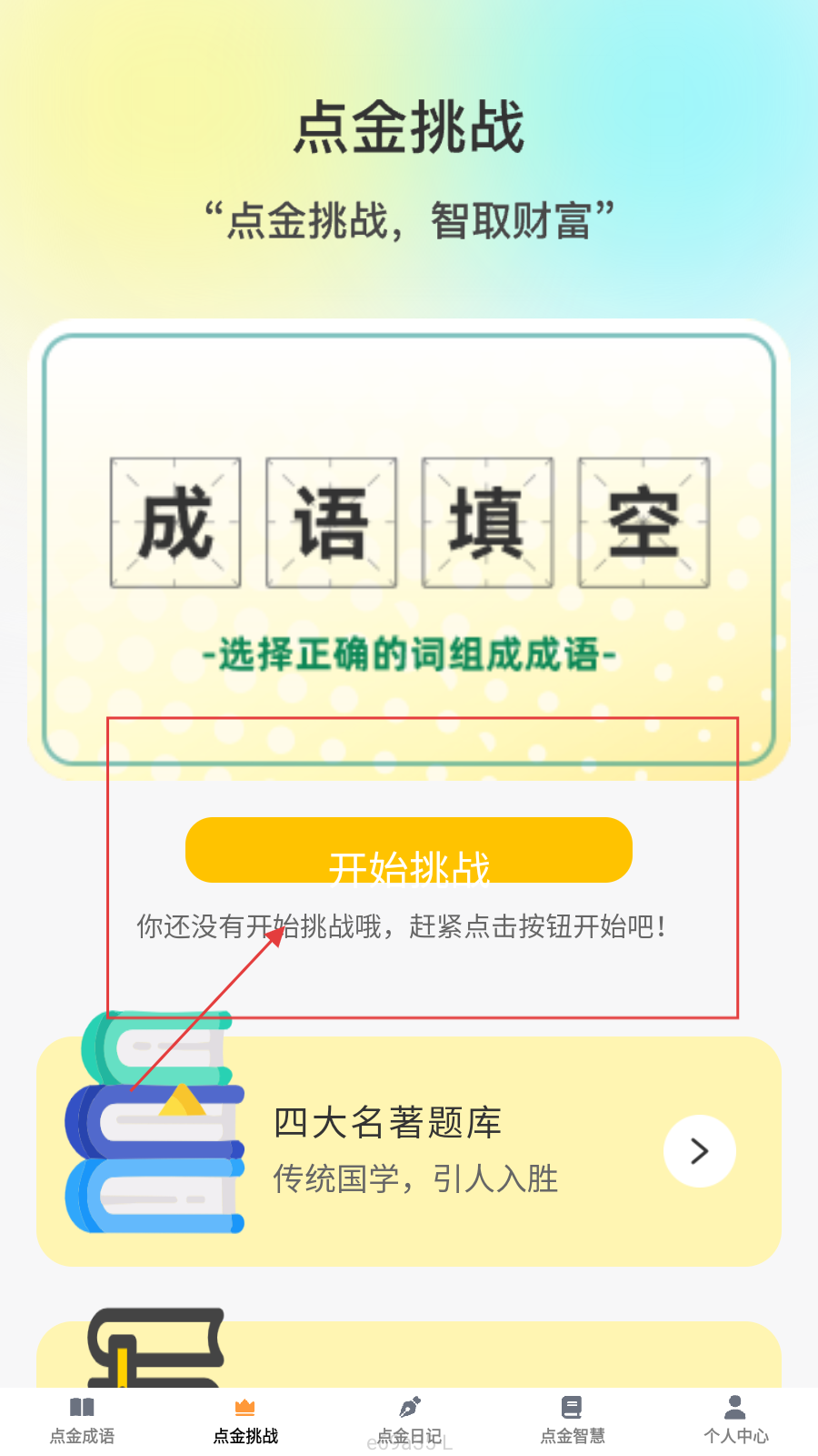3、切换【点金挑战】,点【开始挑战】,开启成语填空答题模式。