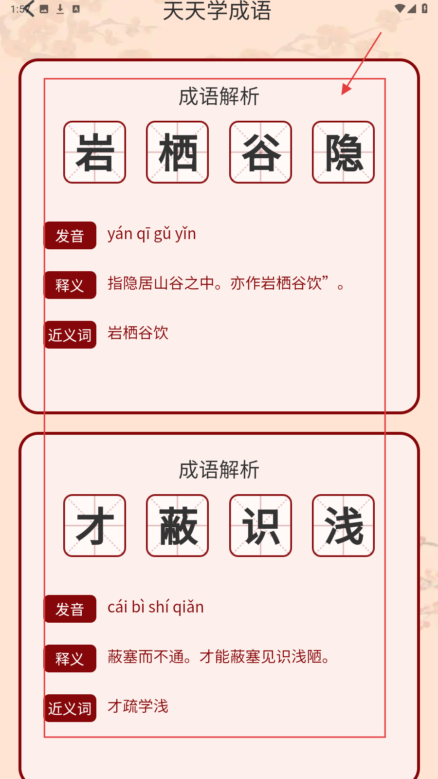 2、在全部成语页,上下滑动查看其他成语,掌握发音、释义和近义词。