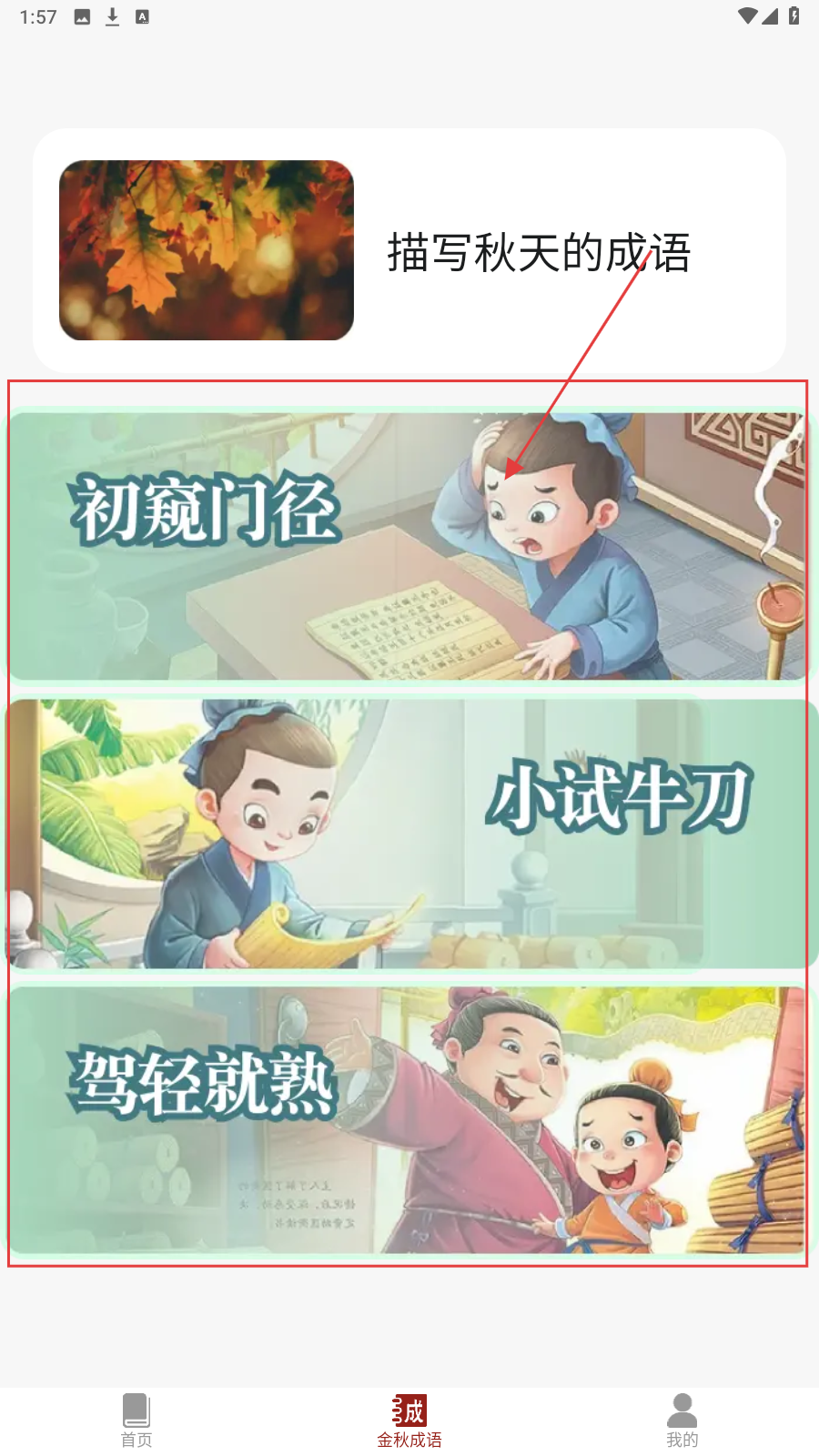 3、切换到金秋成语,选【初窥门径】,开启成语答题挑战。