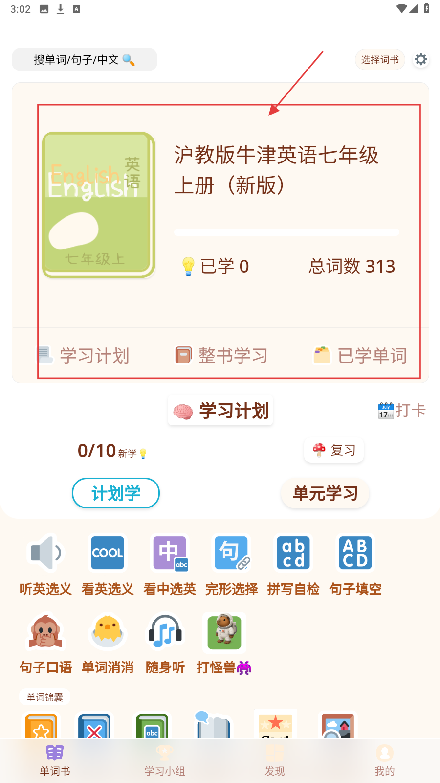 1、打开APP,选定【沪教版牛津英语七年级上册(新版)】词书,开启学习。