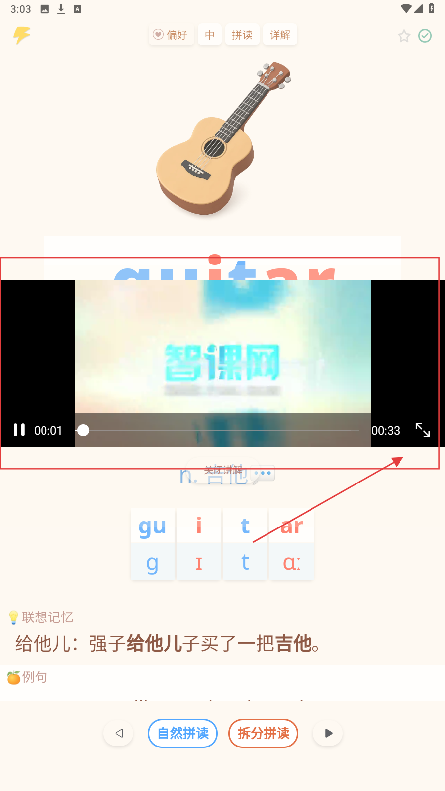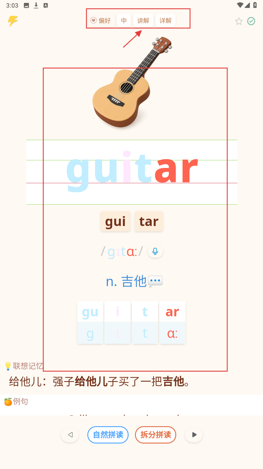 3、学习【guitar】时,点击【讲解】,借拆分、读音模块,强化单词记忆深度。