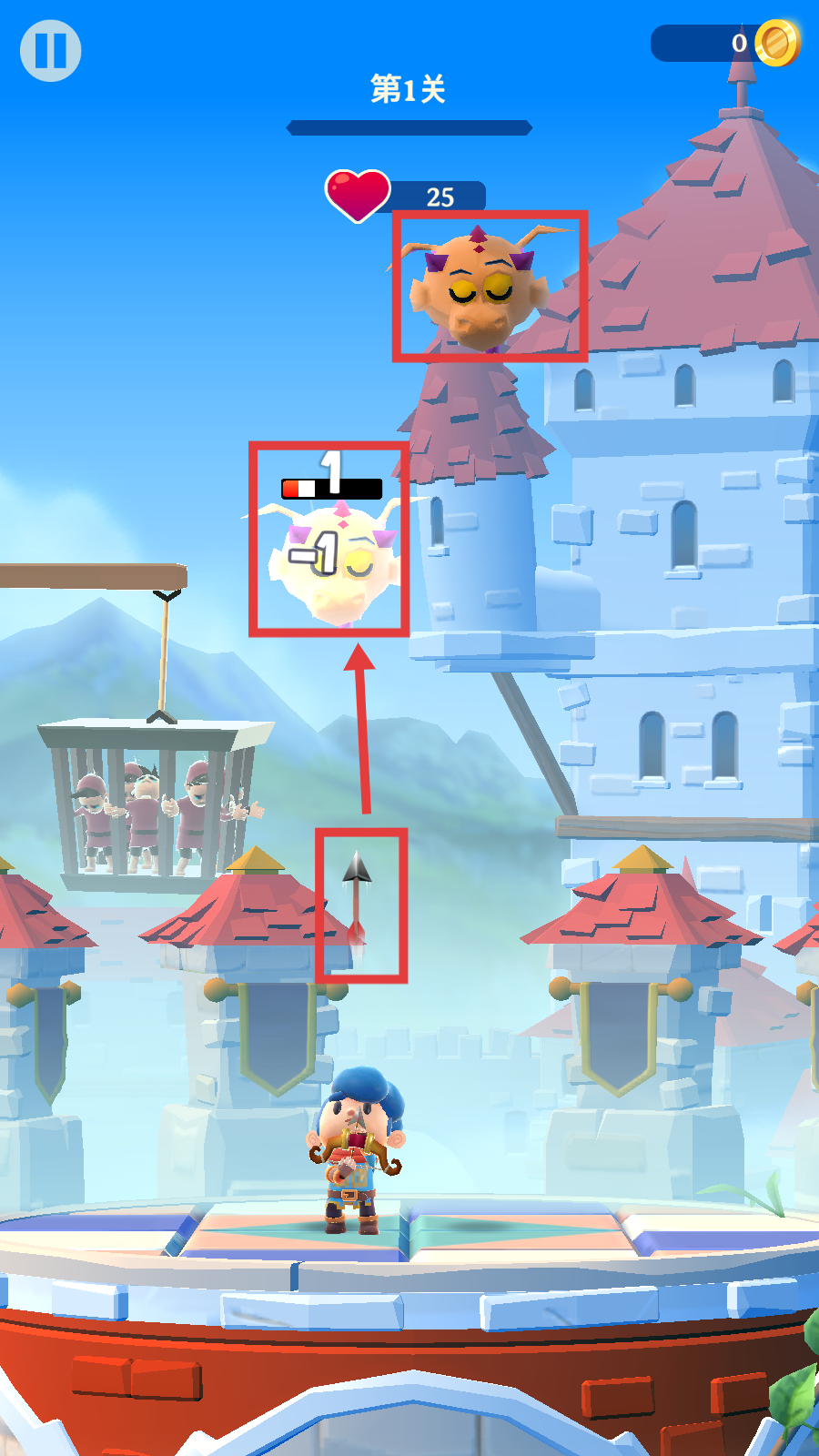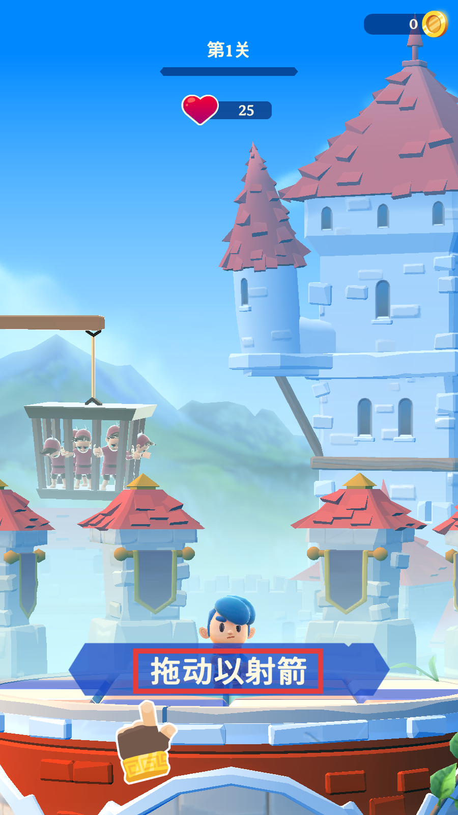 1、第1关按【拖动以射箭】提示操作,瞄准笼中目标射击,初步掌握攻击救援机制。