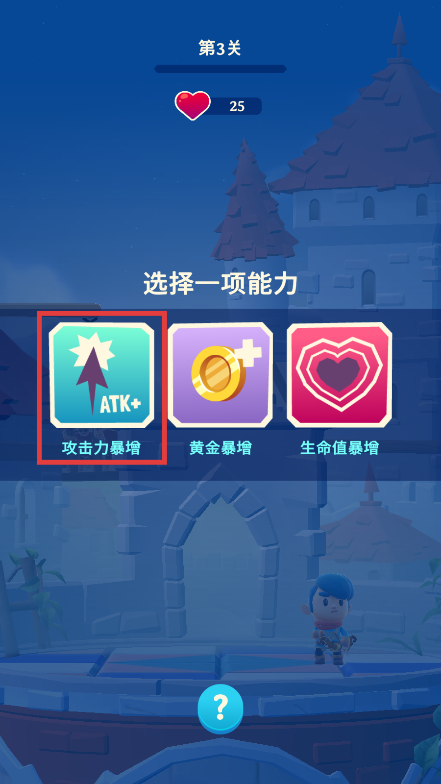 3、第3关选能力,优先点击【攻击力暴增】图标,强化输出,提升后续战斗效率。